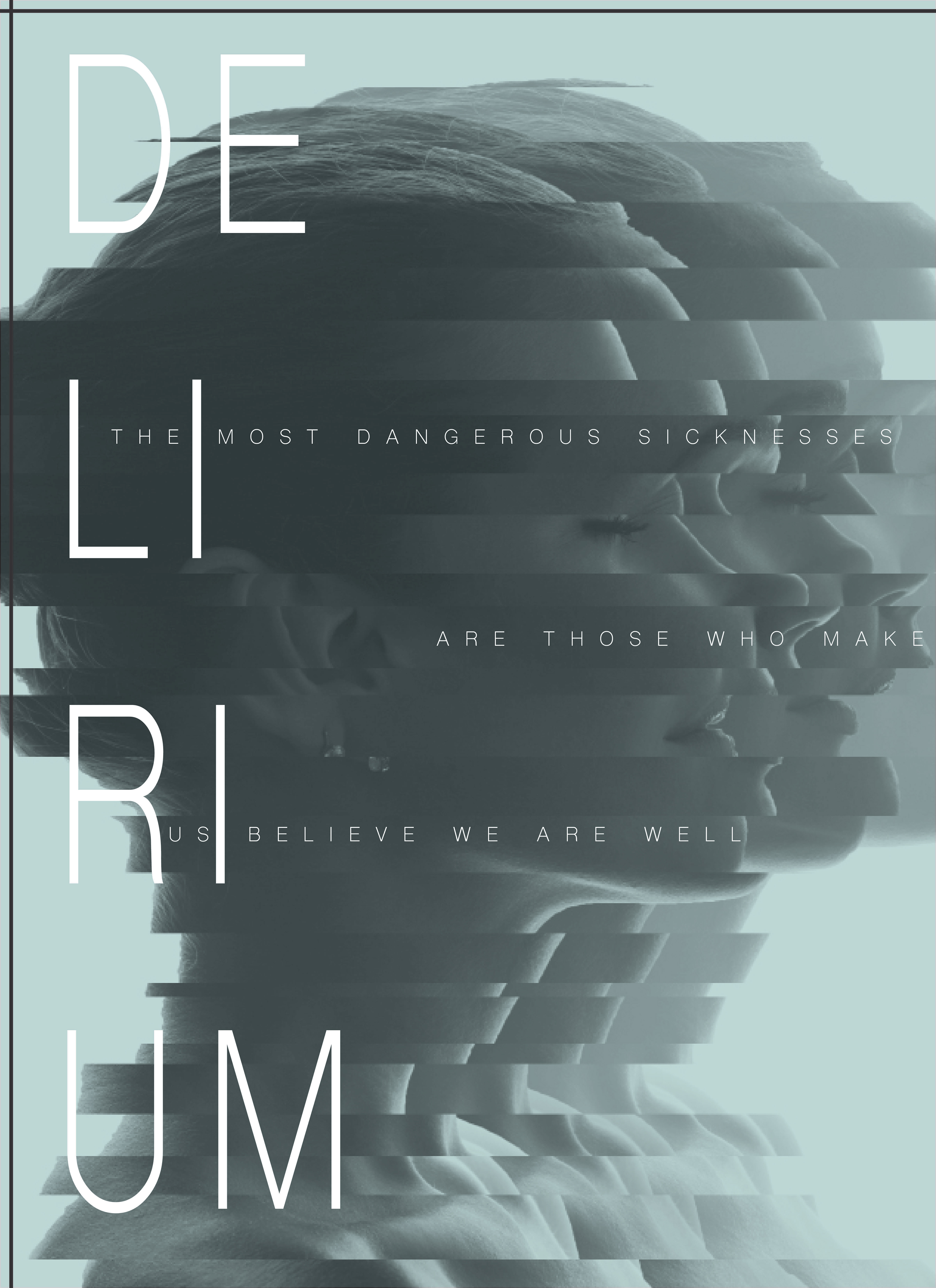 This is a typographic poster for the book, Delirium, by Lauren Oliver. The distorted image suggests the struggle the main character experiences in this novel. The fragmented typography also reitterates this concept.
